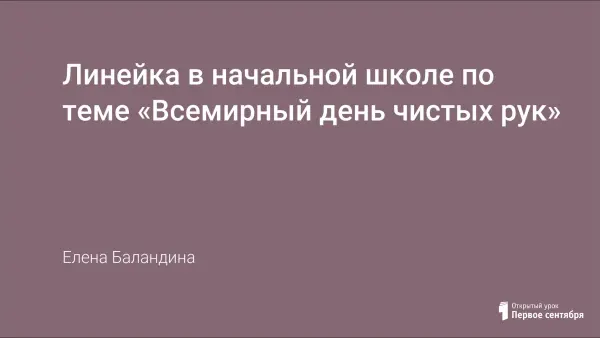 В данной статье представлен материал для проведения линейки в начальной школе, приуроченной ко Всемирному дню чистых рук, во время которой дети совершенствуют умение правильно мыть руки, воспитывается позитивное отношение к культурно-гигиеническим навыкам, формируется навык здорового образа жизни.