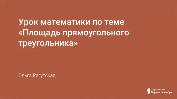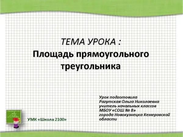 Тип урока – открытие нового знания. Урок использует деятельностный метод обучения. Цель урока: формирование понятий «катет», «гипотенуза» и способа нахождения площади прямоугольного треугольника.