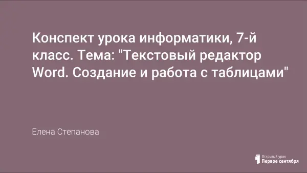 Цель данного урока – познакомить учащихся с технологией создания таблиц и работы с ними (форматирование структурных элементов таблицы, изменение структуры таблицы). Для учащихся подготовлена памятка «Работа с таблицами в текстовом редакторе Word».