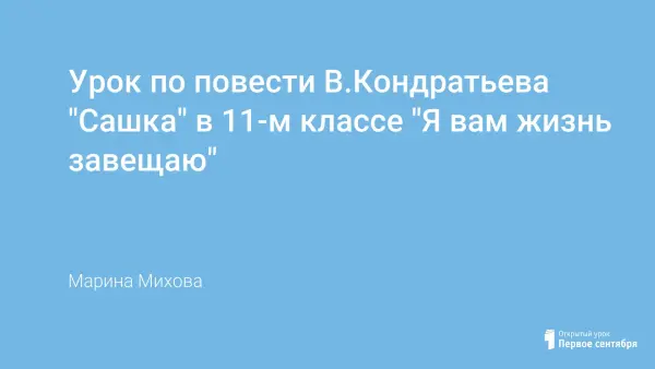 Материал урока по повести В.Кондратьева «Сашка» знакомит одиннадцатиклассников с писателем; позволяет поразмышлять не только о герое, об авторе, но и о себе; даёт представление о необычном подходе писателя к изображению войны; готовит к раскрытию проблем, связанных с войной на примере повести Кондратьева на выпускном экзамене. В повести показано, какую тяжесть нес на своих плечах рядовой русский солдат. Об этом материал данного урока: о страшной войне и сохраненной человечности.