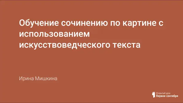 Предлагая ученикам написать сочинение по картине, мы ставим перед ними непростую задачу: «язык» живописи «перевести» на язык словесный. Автор полагает, что важным компонентом обучающих уроков по картине является чтение и анализ искусствоведческого текста. Такой образец помогает учащимся глубже понять содержание, усиливает эмоциональное восприятие картины.