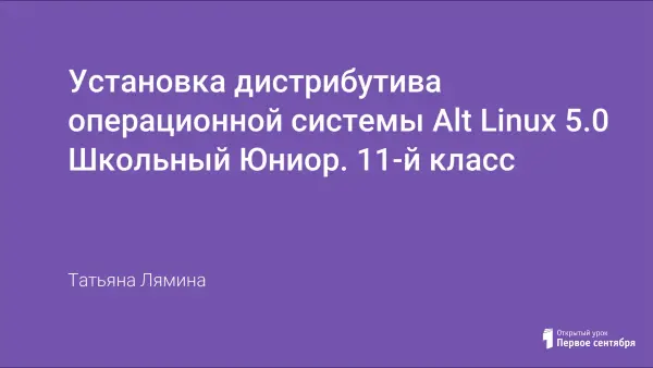 Представленный урок знакомит учащихся с пошаговой установкой свободно распространяемой операционной системой Альт Линукс 5.0 Школьный Юниор и позволяет закрепить знания по теме «Операционные системы». Если технические условия кабинета информатики позволяют, то ход установки лучше продемонстрировать через проектор.
