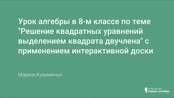 На уроке учащиеся повторяют способы решения неполных квадратных уравнений и рассматривают решение полных квадратных уравнений выделением квадрата двучлена. Для среднего ученика это довольно сложный этап изучения темы. Для поддержания интереса к предмету на уроке используется интерактивная доска.