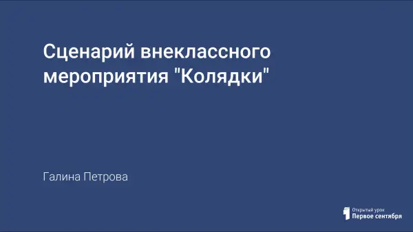 Сценическое представление русского народного праздника, предназначенное для начальной школы, в целях ознакомления с народными традициями русского народа. Коляда означает первый день месяца, следовавший за днями зимнего солнцестояния и совпадающий с большим праздником русской православной церкви – Рождеством Христовым.