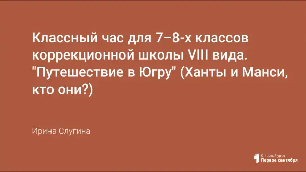Классный час знакомит воспитанников с укладом жизни народов коренных национальностей. Коррекция осуществляется упражнениями на развитие логического мышления, усложнённое заданием на запоминание, упражнением на расслабление и концентрацию, упражнением для профилактики нарушения зрения.