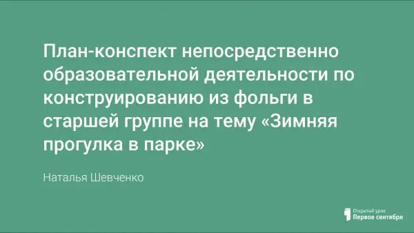 Задачи занятия: вызвать интерес к конструированию фигурок человека из фольги для обыгрывания ситуации: «Прогулка в парке»; совершенствовать умение детей конструировать по схеме; способствовать обогащению и закреплению знаний о материале - аллюминевая фольга; расширять представления детей о фольге, как материале для изготовления поделок; развивать творческое воображение, логическое мышление, интерес к экспериментированию; закрепить правила безопасного поведения при работе с материалами.
