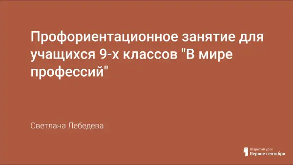 Данное занятие является первым (вводным) в рамках проведения цикла профориентационных занятий с учащимися 9-х классов. Целью данного занятия является формирование ответственного отношения к выбору профессионального пути через актуализацию имеющихся знаний и получения информации о мире профессий, а также помощь участникам в раскрытии свои знаний о профессиях.