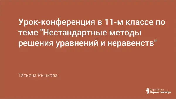 В работе представлен урок-конференция в 11-м классе по теме "Нестандартные методы решения уравнений и неравенств". Речь идет о примерах, которые можно и нужно решать не известными методами, а с использованием свойств функций, в них входящих, а также примерах, для решения которых особенно важны такие качества, как сообразительность, интуиция, высокая логическая культура.