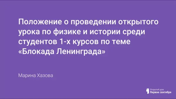 В основе урока лежит документальный фильм о блокаде Ленинграда. Хронологию событий прерывают стихи. Проходит минута молчания. Заключительная слово – ведущего или речь человека, участника событий. В начале и в конце урока звучат песни.