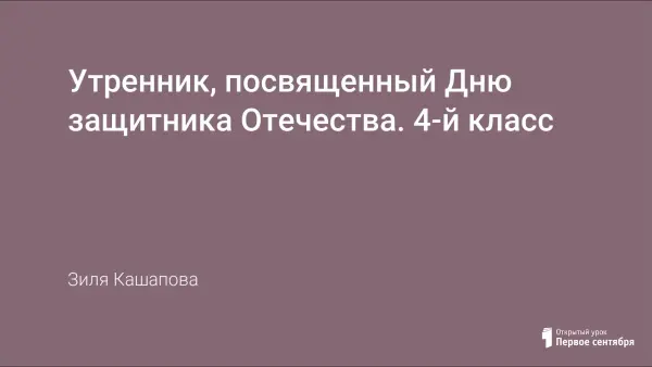 Утренник для учащихся 4-х классов посвящен Дню защитника Отечества, основными задачами которого являются расширение и углубление знаний детей о героях-защитниках родной страны; закрепление знаний, полученных во время экскурсии в музей им. А.Матросова; воспитание чувства патриотизма, уважения и гордости за свою страну; развитие творческих способностей детей.