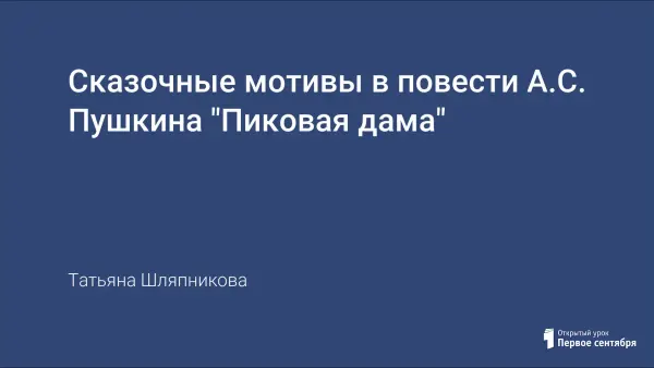 Вашему вниманию предлагается урок-исследование. В сказках, как пишет В.С. Непомнящий, А.С. Пушкин создает "страну величавой простоты и детской ясности, страну, где добро беспримесно отмежевано от зла и всегда торжествует". В этом смысле "Пиковая дама" близка всем пушкинским сказкам.