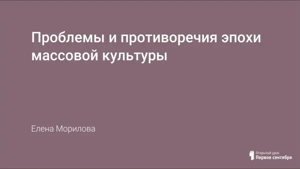 Урок проводится в 9-м классе, при изучении зарубежной истории. Рассматривается происхождение массовой культуры. Говорится о молодежных субкультурах и контркультурах. Приводятся их определения и сводная таблица, демонстрирующая отличительные черты разнообразных субкультур. Дана характеристика элитарной культуры.
