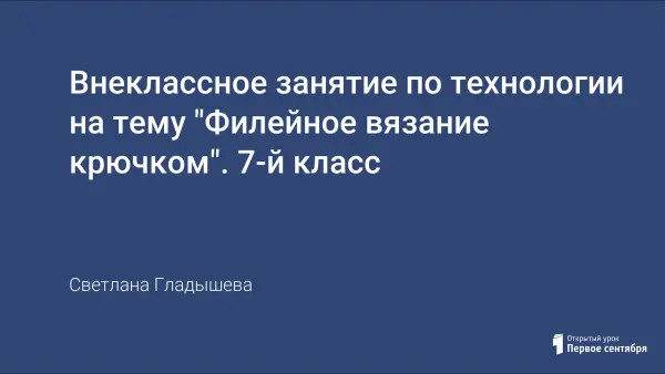 Внеклассная работа – один из важнейших путей проведения содержательной и интересной работы с учащимися. Цель проведения внеклассного занятия – стимулировать познавательный интерес к предмету, углубляя знания, формировать и совершенствовать навыки в технике филейного вязания крючком. Занятие рассчитано на учащихся 7-8-x классов.