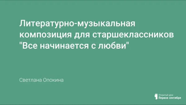 Литературно-музыкальная композиция воспевает стихами и песнями первую любовь, любовь к женщине, матери, ребенку. Это внеклассное мероприятие для старшеклассников. В материале представлены стихи русских и советских поэтов, а также музыка современных композиторов и исполнителей. Чтение стихов позволяет детям раскрыть свои творческие способности. Музыкальный материал может быть исполнен самими школьниками.