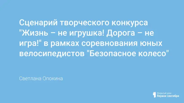 Материал будет интересен всем, кто готовит школьные команды на конкурс - соревнование юных велосипедистов «Безопасное колесо». В статье представлен сценарий творческого конкурса защиты плаката по ПДД на тему «Жизнь – не игрушка! Дорога – не игра!» В приложении вы найдёте плакат, оформленный по данной теме. Кроме этого вашему вниманию предложен буклет – обращение к законопослушным участникам дорожного движения, который можно использовать как раздаточный материал.