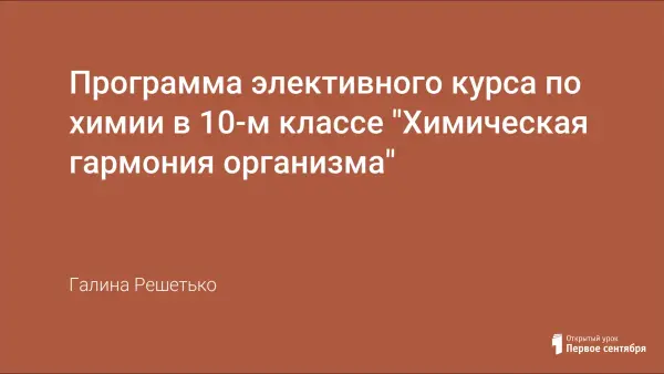 Программа элективного курса раскрывает химическую гармонию жизни во всех её проявлениях. Программа раскрывает проблемы, которые ведут к дисгармонии, – это неправильное питание, курение, злоупотребление алкоголем, недостаток регулярных физических нагрузок, вредные факторы окружающей среды.