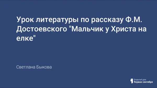 Урок по рассказу Ф.М. Достоевского "Мальчик у Христа на елке" рассчитан на учащихся 5–6-х классов. Несмотря на то, что этот текст принадлежит перу одного из самых "трудных" писателей, рассказ является посильным для восприятия учеников и благодатной почвой для воспитания нравственных качеств детей, особенно этого возраста.