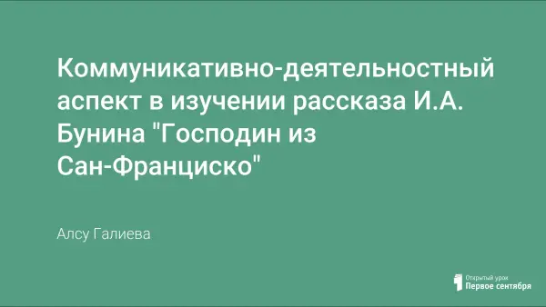 Возможно построение урока-диалога по рассказу И.А. Бунина "Господин из Сан-Франциско". Отправной точкой для анализа на уроке будут служить вопросы учеников к тексту, в центре анализа будут стоять проблемы взаимоотношений сюжета произведения и деталей, а интерпретацией рассказа будет ответ на вопрос: "Почему Бунин решил быть "недобрым" писателем в этом рассказе?"