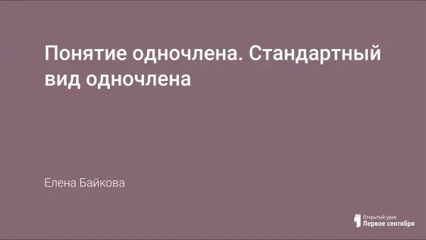Цели урока – познакомить учащихся с понятием одночлена; выработать умение приводить примеры одночленов. Познакомить учащихся с понятием «стандартный вид одночлена». Ввести алгоритмом приведения одночлена к стандартному виду. Выработать у учащихся практические навыки применения алгоритма приведения одночлена к стандартному виду.