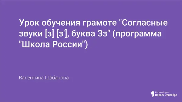 Урок обучения грамоте в увлекательной форме знакомит учеников со звуками [З], [З΄] и буквой, которая их обозначает. Ребята учатся отличать звук [З], [З΄] и букву, которая их обозначает от других звуков и букв; учатся читать слоги слова с новыми буквами. Урок способствует развитию фонематического слуха, мышления, обогащению словарного запаса учащихся.