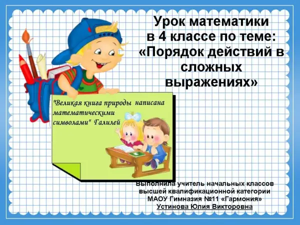 Урок математики в 4-м классе направлен на формирование умения определять порядок действий в выражениях без скобок и со скобками; совершенствование навыка решения задач; развитие умения анализировать и обобщать.