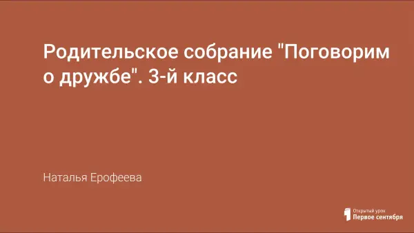 Родительское собрание должно помочь родителям понять, что дружба имеет большое значение для ребенка. Родители и дети беседуют о том, что такое дружба, каким должен быть настоящий друг, вместе играют, создают «законы дружбы», что формирует у родителей интерес к делам класса и взаимоотношениям в детском коллективе.