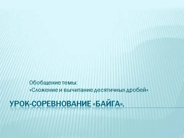 Урок проводится на обобщение темы. Проходит он в виде казахской национальной игры-соревнования «Байга». Название урока ребята отгадывают, решая задания устного счета. После чего идет рассказ об этой игре и конкурсы.
