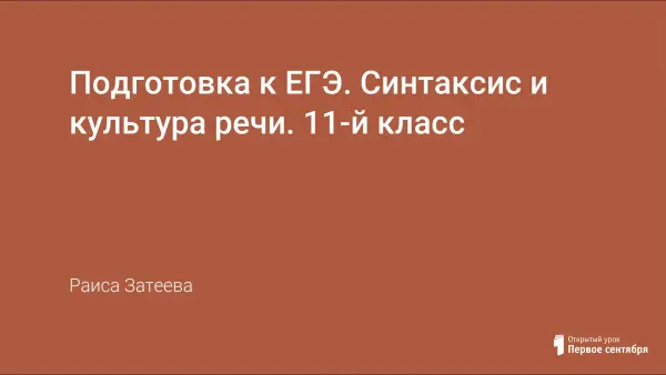 Урок-практикум посвящен обобщению материала по синтаксису и культуре речи в 11-м классе для подготовки учащихся к ЕГЭ. Цели урока – систематизация знаний о словосочетании, об односоставных предложениях; повторение сложных вопросов различных разделов языкознания, формирование навыков культуры речи.