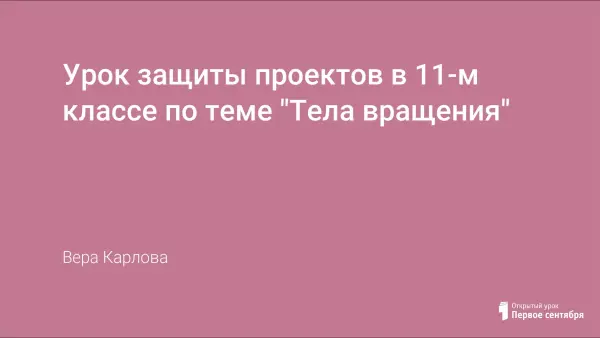Урок является обобщающим по теме «Тела вращения» и проводится в рамках проектной деятельности с применением информационно-компьютерных технологий. На этом занятии учащимся предстоит итоговая защита проектов, над которыми они работали в течение изучения темы. На уроке представлены работы, демонстрирующие результаты самостоятельной работы учащихся.