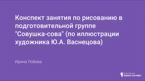 На занятии продолжается знакомство детей с иллюстрациями художника-иллюстратора Юрия Алексеевича Васнецова к детским художественным произведениям. Дети учатся изображать знакомый образ птицы к известной потешке «Совушка», передавая форму и строение частей тела, их расположение, соблюдая пропорции между ними.