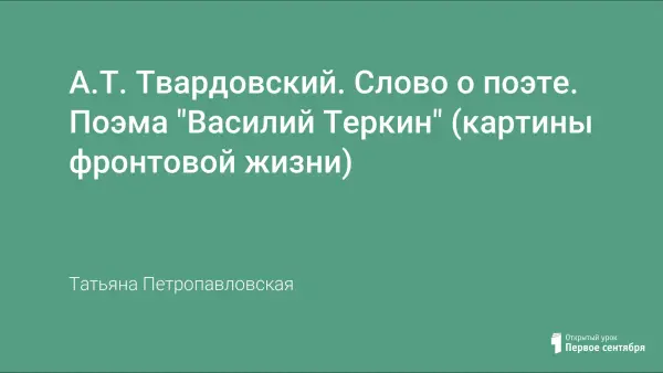 Структура урока позволяет, опираясь на уже известные ученикам сведения о биографии и творчестве Твардовского, расширить и углубить их знания, проследить автобиографические черты поэта в образе Теркина, обосновать композиционное строение поэмы и ее социальную и художественную значимость.