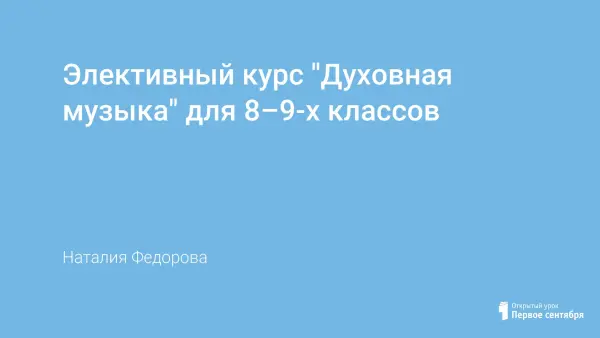 Засилье рекламы по радио и телевидению, компьютерные игры, огромный поток информации мешают подростку найти правильные ориентиры в жизни, подавляют его творческое мышление и эмоциональную культуру, все дальше и дальше отдаляют от нравственных идеалов, этических и эстетических ценностей. Вот почему родилась идея создания элективного курса "Духовная музыка" для учащихся 8–9-х классов.