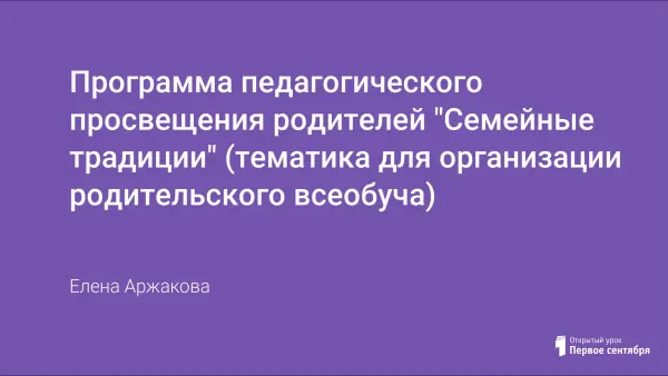Представленная программа призвана содействовать возрождению лучших отечественных традиций семейного воспитания, восстановлению традиционного уклада жизни, формировать активную педагогическую позицию родителей, привлекать их к активному включению во внеурочную досуговую деятельность.