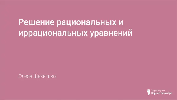 На уроке обобщаются теоретические знания о рациональных и иррациональных уравнениях; формируются умения выбирать наиболее рациональные способы решения иррациональных уравнений; закрепляются основные методы решения иррациональных уравнений базового и повышенного уровня сложности.
