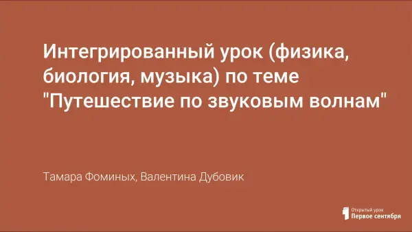 Интегрированный урок «Путешествие по звуковым волнам» проводится в 9-м классе. Целью данного урока является интеграция знаний по физике, биологии, музыке. Интеграция знаний по этим предметам дает возможность закрепить, обобщить, расширить и углубить знания, полученные на предыдущих уроках и в разных предметах.
