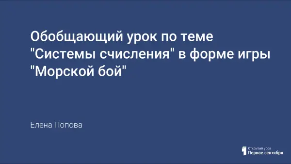 В статье представлен конспект обобщающего урока по информатике. В результаты урока обобщаются и систематизируются знания учащихся по переводу чисел в различных системах счисления, вычислениям в двоичной, восьмеричной, шестнадцатеричной системах счисления. Урок представлен в виде игры «Морской бой», чтобы привлечь внимание учащихся к предмету информатики.