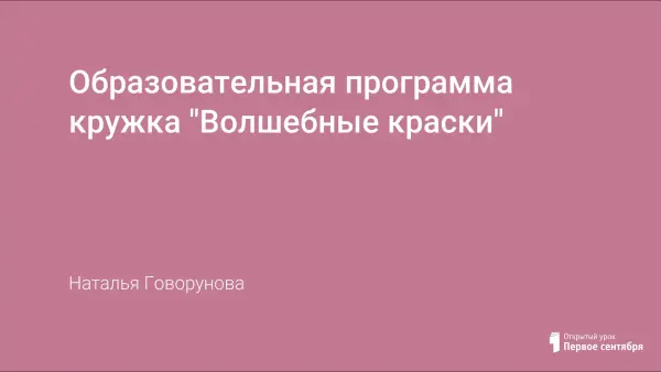 Образовательная программа кружка «Волшебные краски» предназначена для учащихся в основной школе, а также интересующихся предметом, одаренных учащихся с 3-й по 9-й класс, обеспечивает дополнительную теоретическую и практическую подготовку по изобразительному искусству.