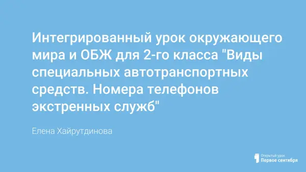 Урок направлен на расширение и обобщение представления детей о видах наземного транспорта. Автор создает условия для формирования понятия "специальный автотранспорт", "проблесковый маячок", "сирена", закрепляет знания учащихся о номерах телефонов экстренных служб и умение сопоставлять эти номера со специальными транспортными средствами.