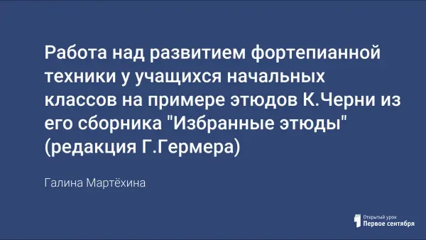 Статья посвящена одной из важнейших тем в музыкальной педагогике – развитию фортепианной техники в начальный период обучения пианиста. Рассматривается работа над этюдами К.Черни из его сборника «Избранные этюды» (редакция Г.Гермера), даны методические рекомендации.