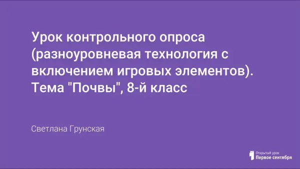 В разработке урока контрольного опроса учащихся с включением игровых элементов использована технология дифференцированного обучения учащихся. Главной целью данного урока и примененной в нем технологии является осуществление итогового контроля знаний и умений по теме «Почвы и почвенные ресурсы».