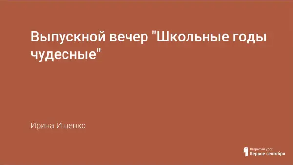Выпускной вечер – традиционный школьный праздник, который остается в нашей памяти навсегда. Это грусть и радость, добрые напутствия, символ расставания с детством. В работе представлен сценарий проведения выпускного вечера.