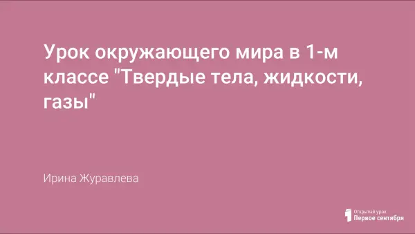 Урок по окружающему миру в 1-м классе по ОС «Школа 2100» призван ввести понятия и познакомить с отдельными свойствами твёрдых тел, жидкостей, газов, расширять кругозор учащихся, воспитывать бережное отношение к природным богатствам.