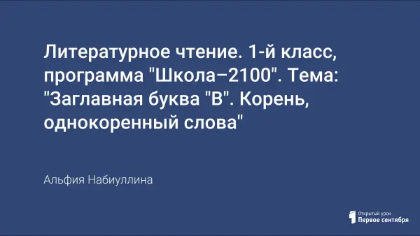 Урок литературного чтения в 1-м классе (программа «Школа–2100») учит коллективной работе, самостоятельности, у доски, по карточкам, правильно употреблять заглавную букву "В", образовывать слова с суффиксами -ушк-, -ок-, -ик-, плавному слоговому чтению, работать над текстом; развивать фонематический слух, внимание, воображение, память, сравнивать, анализировать, обобщать; воспитывает любознательность, наблюдательность, интерес к чтению и русскому языку.