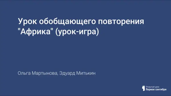 Урок проводится в форме игры с применением компьютера (ноутбука) и мультимедийного проектора, в ходе которого учащиеся определяют местонахождение основных географических объектов Африки; устанавливают причинно-следственные связи между различными компонентами природы; работают с различными географическими картами, в том числе сопоставляя их, и с другими источниками географической информации.