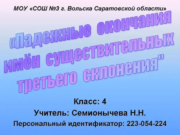 В статье рассказывается о том, как научить распознавать признаки определения падежа имен существительных и правописание падежных окончаний существительных 1-го, 2-го и 3-го склонения. На уроке применяется познавательная деятельность через проблемную ситуацию, развивается внимание, зрительная память, логическое мышление учащихся на основе упражнений.