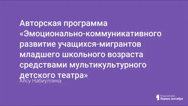 С целью повышения эмоционально-коммуникативного развития детей мигрантов был выбран метод работы с учащимися – театральная детальность. Данная авторская программа мультикультурного детского театра «БалаТим» разработана на один учебный год и в настоящее время успешно реализуется в образовательном учреждении г.Казань. На наш взгляд, уже после первого года реализации данной программы педагоги смогли достичь поставленной цели работы с детьми-мигрантами.