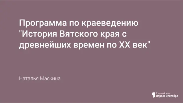 Программа для учащихся 12-16-ти лет призвана дать представление об историческом прошлом и настоящем Вятского края. Практические, частично-поисковые и исследовательские методы и приёмы организации учебной деятельности нацелены на выработку навыков работы со всевозможными источниками краеведческой информации: справочными и учебными пособиями, рукописными материалами, иллюстрациями, фотоматериалами, средствами телевидения, радио и печатными периодическими изданиями, художественной литературой.