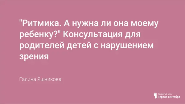 Ритмика для детей с нарушением зрения - это своевременная коррекционно-педагогическая помощь, - это физическая активность, - это творческий процесс, который дает возможность детям выражать свои чувства посредством ритмических движений, движений телом, жестикуляцией рук. Ритмика - это средство для дружелюбного общения и совместной деятельности, - это развлечение и получение удовольствия.