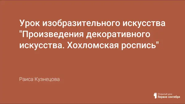 В течение четырех лет обучения в начальной школе дети знакомятся с народной росписью Городца, Хохломы, с народной деревянной и глиняной игрушкой, с народной керамикой Гжели. Задача урока – обобщение знаний учащихся об изученных жанрах русского декоративного искусства, использования практических умений и навыков, приобретенных на предыдущих уроках декоративного рисования, знакомства с народным промыслом - хохломской росписью.