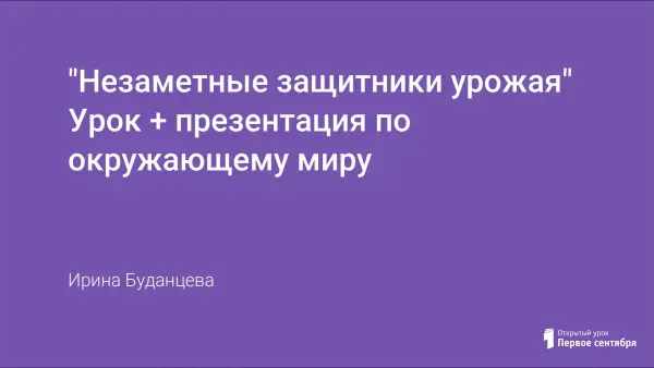 Урок помогает сформировать представления учащихся о незаметных защитниках урожая, о защите урожая без ядохимикатов; развивать познавательную активность, умение работать с дополнительной литературой; воспитывать любовь к природе и развивать чувство ответственности.